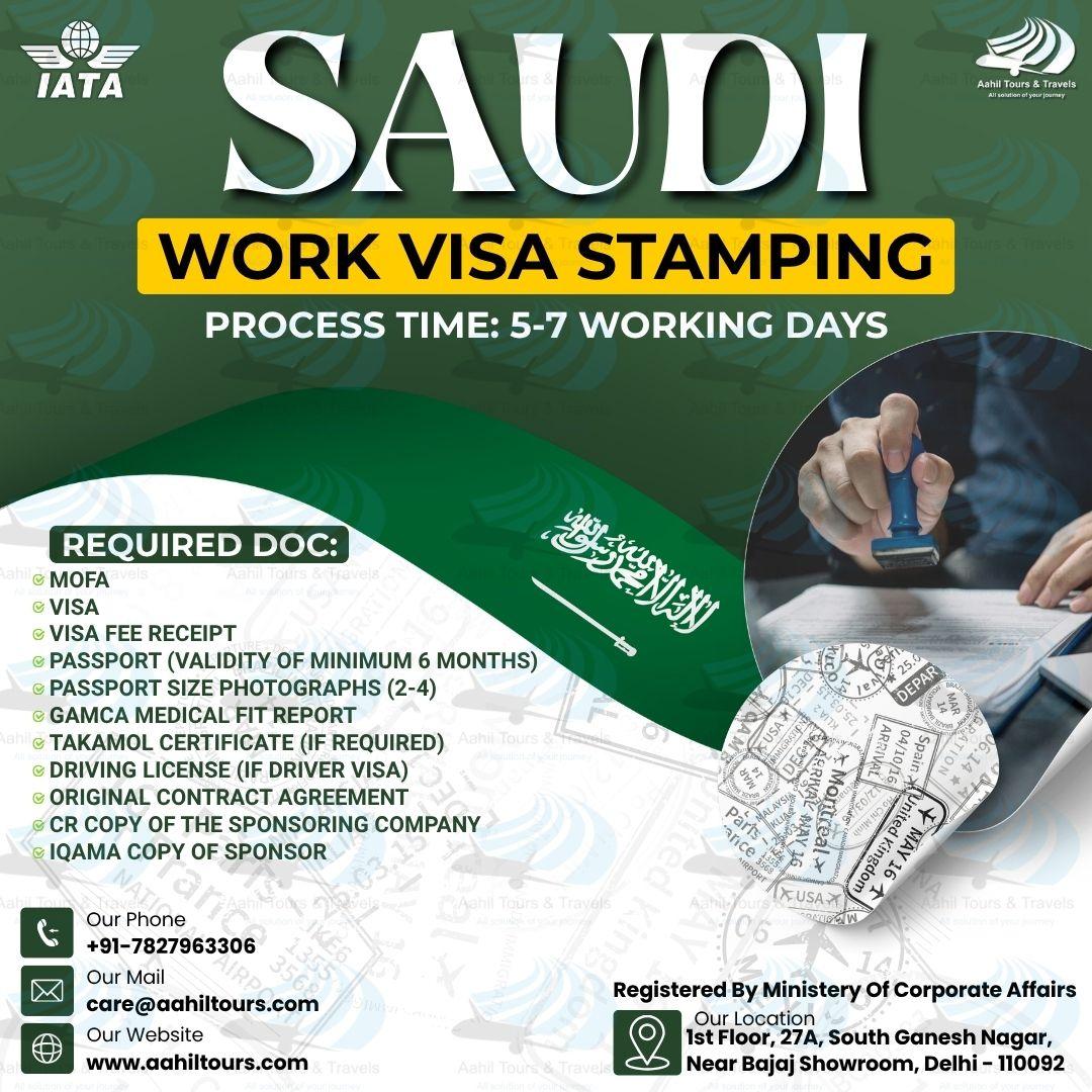 Planning to work in Saudi Arabia? Get your Saudi Work Visa Stamping completed in just 5–7 working days with Aahil Tours & Travels – your reliable visa experts registered under the Ministry of Corporate Affairs