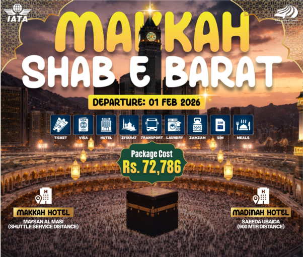 Departing 01 Feb 2026, experience a blessed journey to Makkah & Madinah. Package includes Visa, Air Ticket, Hotel Stay, Ziyarat, Transport, Laundry, Zamzam, SIM & Meals.