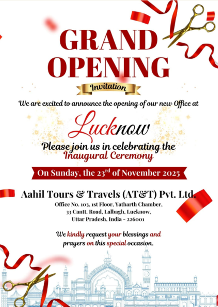Aahil Tours & Travels (AT&T) Pvt. Ltd. is thrilled to announce the Grand Opening of our new office in Lucknow on 23rd November 2025 !