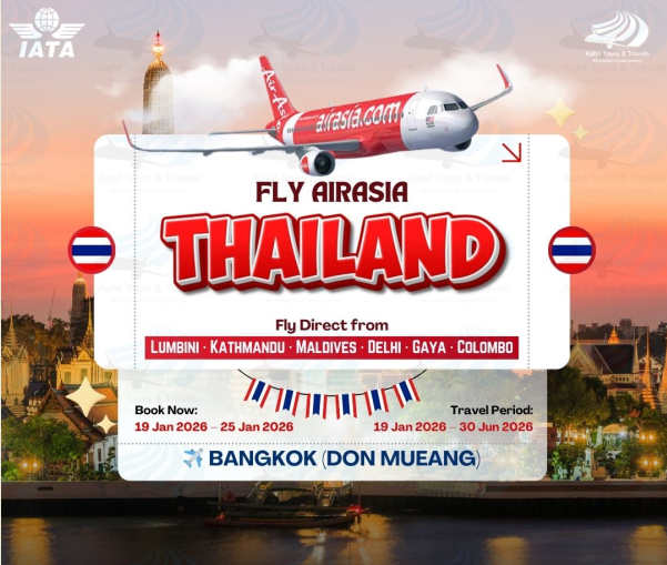 Call: +91 - 9580828826 E-mail: lucknow@aahiltours.comβοΈπΉπ Fly AirAsia to Thailand with smooth direct flights from Lumbini, Kathmandu, Maldives, Delhi, Gaya & Colombo to Bangkok (Don Mueang). π Book: 19–25 Jan 2026 | Travel till 30 Jun 2026 Limited seats—plan your Thailand getaway now! π΄β¨ Aahil Tours & Travels (AT&T) Private Limited Head Office: 1st Floor, 27A, Near Bajaj Showroom, South Ganesh Nagar, Delhi - 110092, India Call: +91 - 8368803077 E-mail: care@aahiltours.com Registered Office: Office No. 103, 1st Floor, Yatharth Chamber, 33 Cantt. Road, Lalbagh, Lucknow - 226001 India Call: +91 - 9580828826 E-mail: lucknow@aahiltours.com0 Reacties 0 aandelen 65 Views 0 voorbeeld