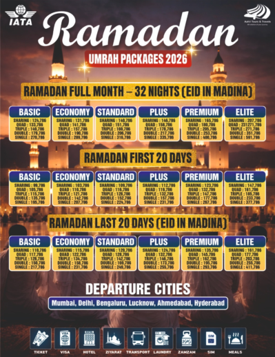 Fulfil your sacred journey with our Super Saver, Regular & VIP Umrah Packages. Choose from Basic to Executive options with sharing, quad, triple, double & single rooms. Trusted airlines, complete assistance, and transparent pricing for a smooth Umrah experience. Book now for peace of mind.