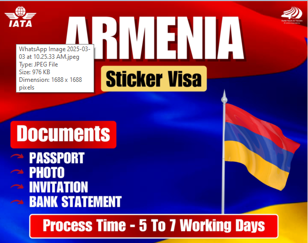 🌍✈️ Planning a trip to Armenia? Get your Sticker Visa hassle-free! 📝 Required Documents: Passport, Photo, Invitation & Bank Statement ⏳ Processing Time: Just 5 to 7 working days! 📍Apply now and explore the beauty of Armenia 🇦🇲 📞 Contact us https://wa.me/917827963306