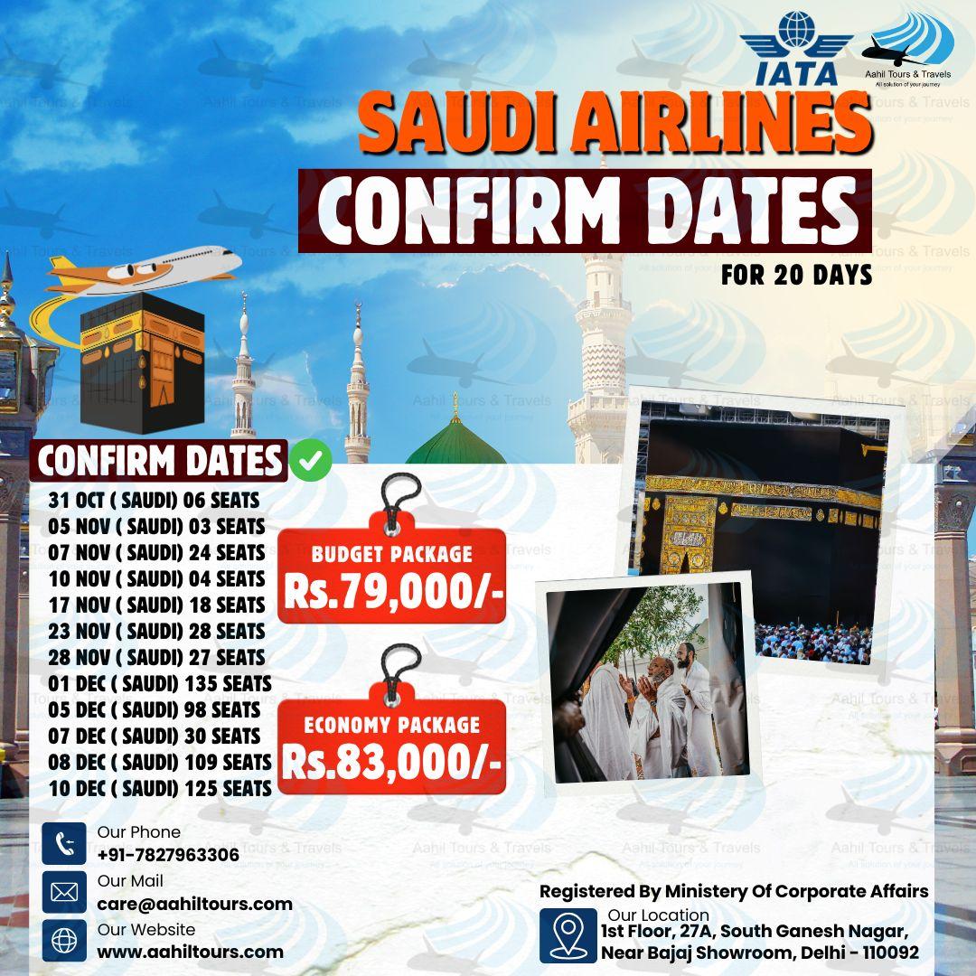 Perform Your Blessed Umrah with Saudi Airlines – Confirm Dates Available! Start your spiritual journey with Aahil Tours & Travels, offering 20 Days Umrah Packages at the best prices! Packages Starting From: Budget Package: โ‚น79,000/- Economy Package: โ‚น83,000/- Saudi Airlines Confirm Dates: 31 Oct | 05 Nov | 07 Nov | 10 Nov | 17 Nov | 23 Nov | 28 Nov | 01 Dec | 05 Dec | 07 Dec | 08 Dec | 10 Dec Package Includes: Return Saudi Airlines Ticket Umrah Visa with Insurance Hotel Stay in Makkah & Madinah Daily Ziyarat & Private Transport Professional Guidance Throughout Limited seats available – Book your Umrah package today! ๐Ÿ“ž Contact us https://wa.me/917827963306