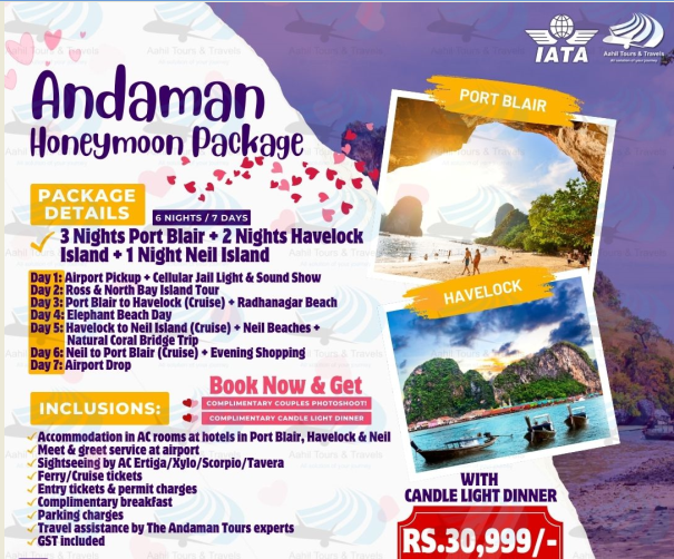 🌴✨ **Experience the Most Romantic Honeymoon in Andaman!** πŸ’‘πŸ”₯ Create unforgettable memories with our **6 Nights / 7 Days Andaman Honeymoon Package**, designed specially for couples who want luxury, romance & adventure in one perfect trip! ❀️🌊 πŸ–οΈ **PACKAGE DETAILS:** 🌟 3 Nights Port Blair 🌟 2 Nights Havelock Island 🌟 1 Night Neil Island πŸ“ **Day Wise Itinerary:** Day 1: Airport Pickup + Cellular Jail Light & Sound Show πŸŽ₯ Day 2: Ross & North Bay Island Tour 🌴🐠 Day 3: Port Blair to Havelock (Cruise) + Radhanagar Beach – Asia’s Best Beach 😍 Day 4: Elephant Beach Day – Water Sports & Fun Activities 🀿🚀 Day 5: Havelock to Neil Island (Cruise) + Neil Beaches πŸ–οΈ Day 6: Neil to Port Blair (Cruise) + Evening Shopping πŸ›οΈ Day 7: Airport Drop ✈️ πŸ’ **BOOK NOW & GET FREE:** πŸ“Έ Complimentary Couples Photoshoot 🍽️ Complimentary Candle Light Dinner 🏨 **INCLUSIONS:** βœ… Accommodation in AC Hotels – Port Blair, Havelock & Neil βœ… Meet & Greet Service at Airport βœ… Transfers by AC Ertiga / Xylo / Scorpio / Tavera βœ… Ferry/Cruise Tickets βœ… Breakfast Included βœ… Expert Guidance by The Andaman Tours Team βœ… GST Included πŸ”₯ ALL THIS JUST @ **β‚Ή30,999/-** ONLY! 😱πŸ’₯ Make your honeymoon magical with crystal-clear waters, romantic beaches, luxury stays & unforgettable experiences! πŸ’‘πŸŒ… πŸ“ž Contact us https://wa.me/917827963306